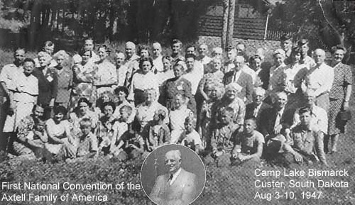 The First National Convention of the Axtell Family of America held since the 1643 Sudbury, Massachusetts landing of Thomas, brother of Col. Daniel Axtell, the Regicide, held at Camp Lake Bismark, Custer, South Dakota, August 3-10, 1947.